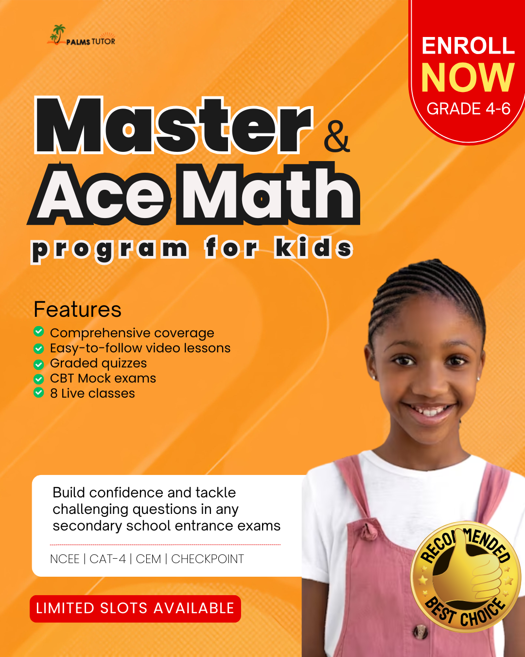 The Master and Ace Math Program is a comprehensive, interactive learning experience designed to prepare kids for their secondary school entrance exams confidently and easily. This program provides a solid foundation in mathematics through engaging video lessons, marked quizzes, standard mock tests, and interactive live group sessions.